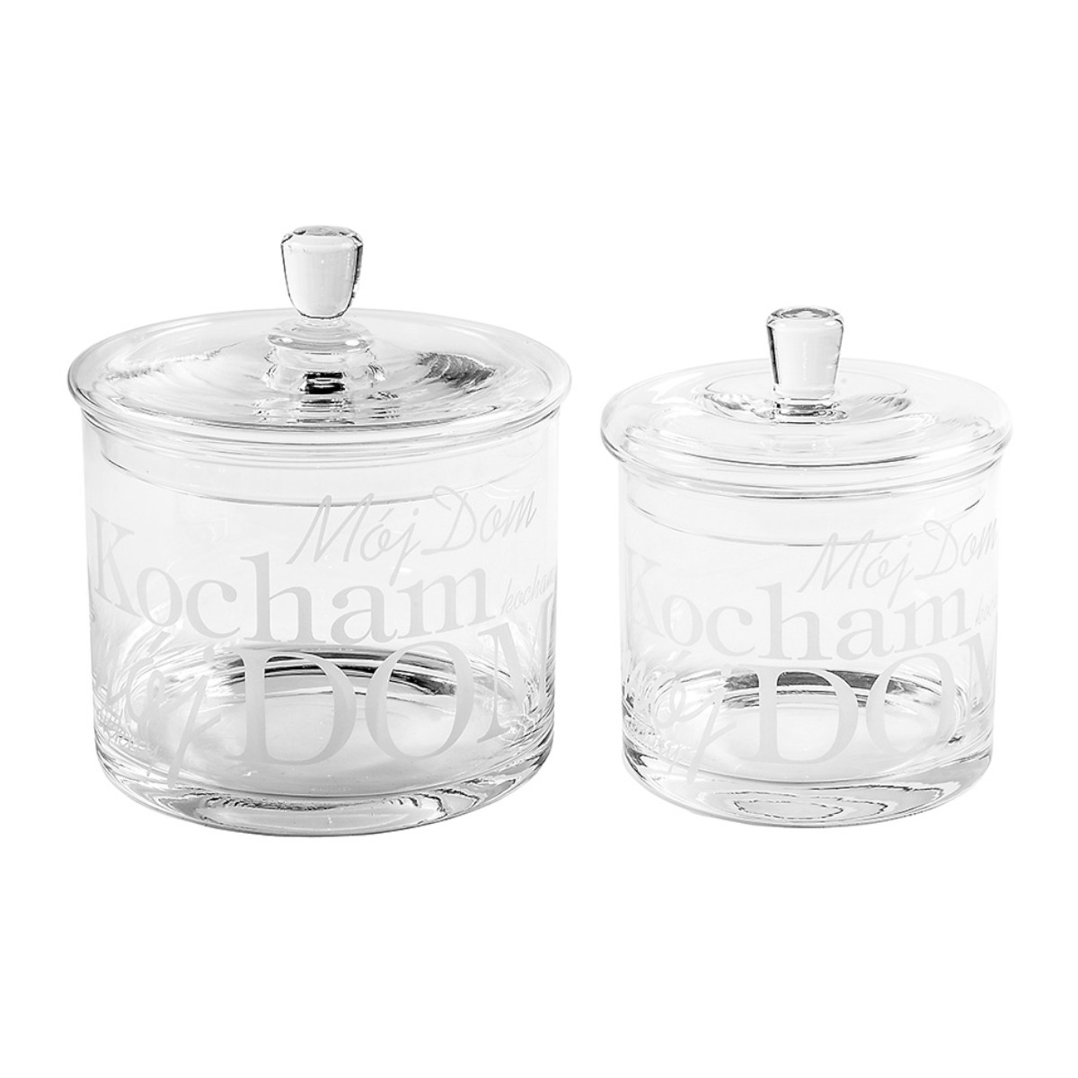 Zamykany szklaną pokrywką pojemnik w kształcie walcowatym, z klimatycznymi napisami.