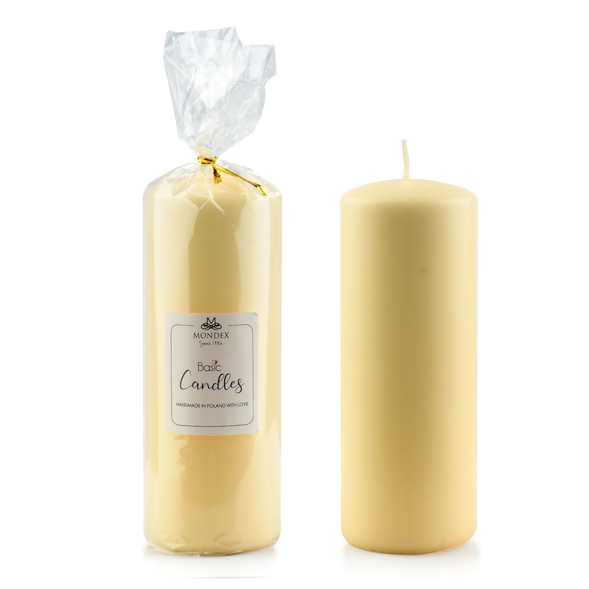 Świeca parafinowa o kształcie walca z bawełnianym knotem. Zapakowana w folię, która zabezpiecza świecę przed ubrudzeniem.