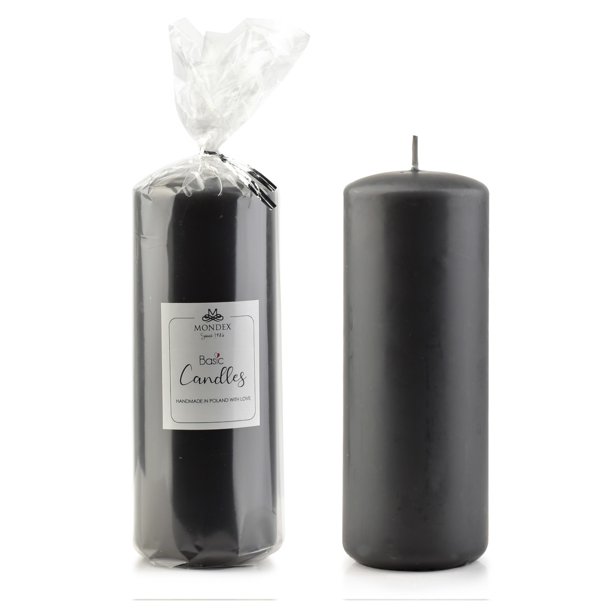 Świeca parafinowa o kształcie walca z bawełnianym knotem. Zapakowana w folię, która zabezpiecza świecę przed ubrudzeniem.