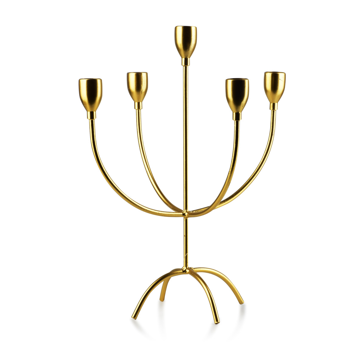 Świecznik wieloramienny wykonany z metalu w kolorze złotym. Pomieści pięć świec stołowych, dopełni aranżację każdej jadalni i salonu. Klasyczna elegancja! Wymiar; 25x16xh32cm Waga: 410g