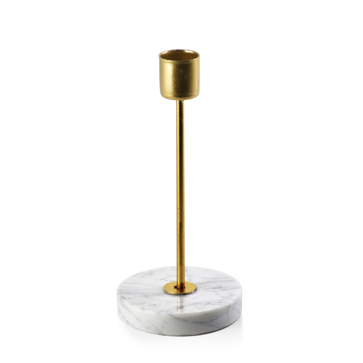 Nowoczesny świecznik wykonany z konglomeratu oraz metalu w kolorze złotym. Na jedną świecę stołową. Spód jest zabezpieczony folią którą należy zdjąć przed umieszczeniem świecy.