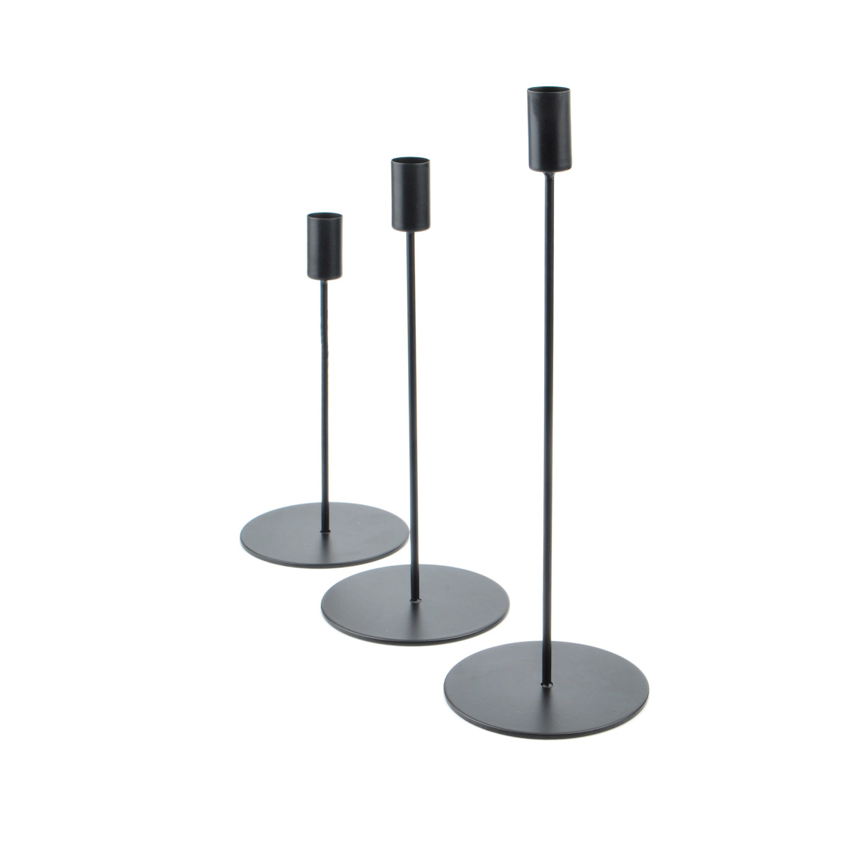 Świecznik wykonany z metalu. Jest wąski, elegancki, w kolorze czarnym, opiera się na okrągłym standzie.
