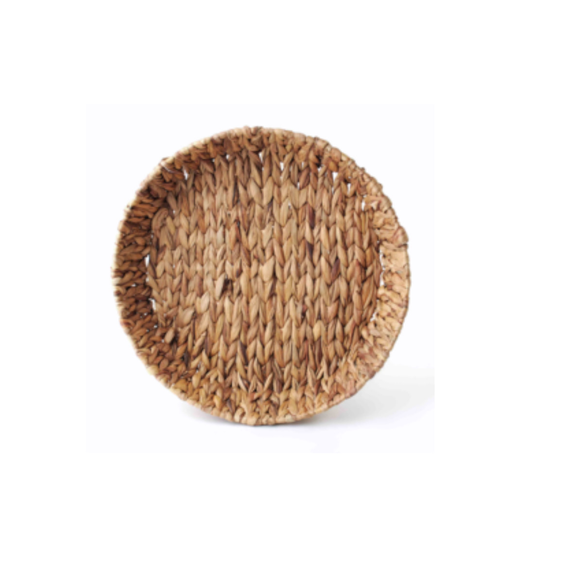 Okrągła taca wypleciona z hiacyntu wodnego z serii AMPARO. Stanowi naturalny element wystroju każdego pomieszczenia. Wodne