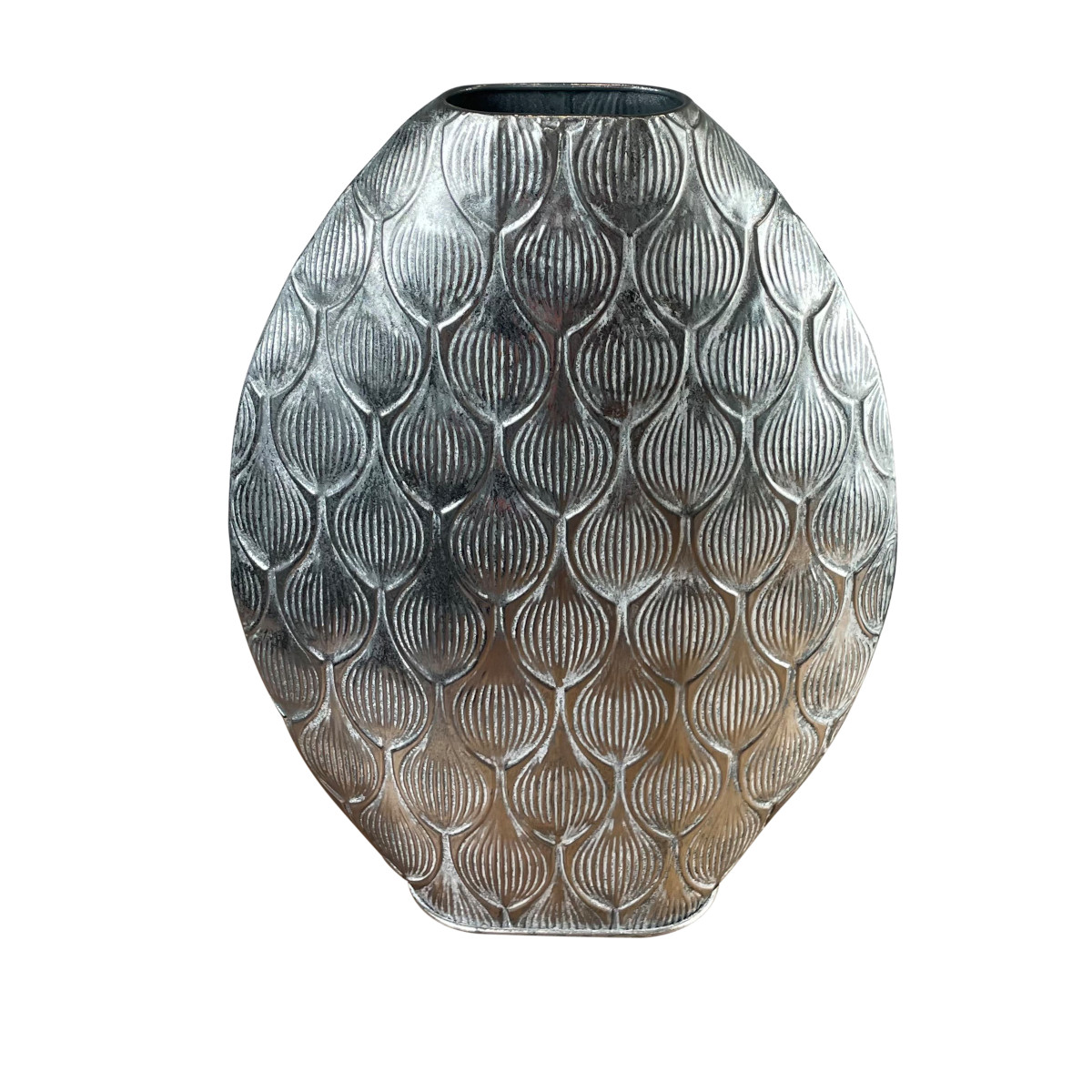 Wazon wykonany z metalu, pokryty kolorem stare srebro.