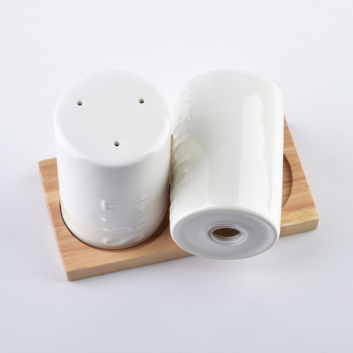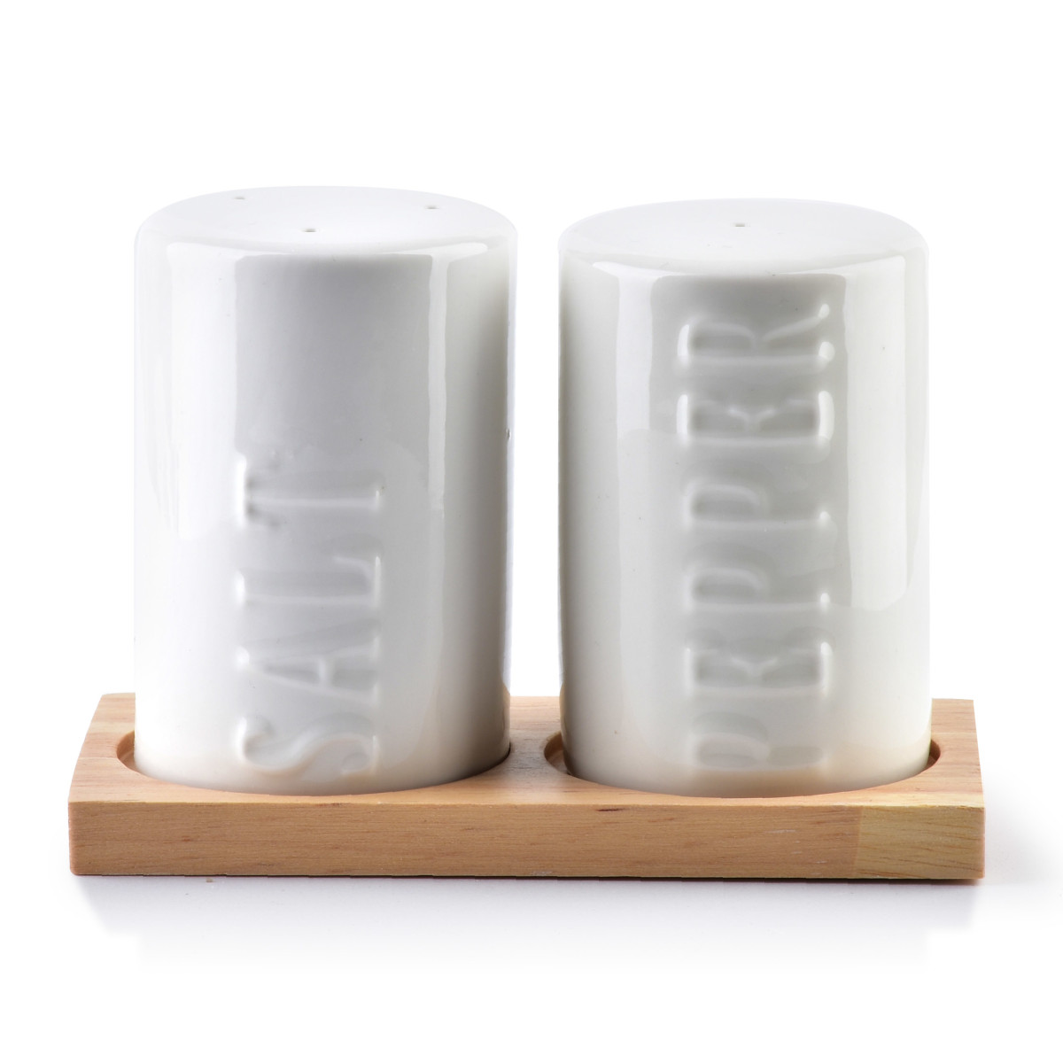 Komplet porcelanowych przywrotników sól i pieprz . Komplet posiada wytłoczone napisy w języku angielskim oraz bambusową podstawkę. Nowoczesny i uniwersalny - pasuje do każdej kuchni i jadalni.