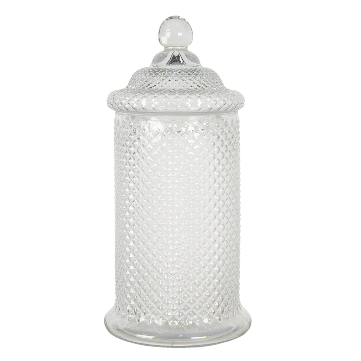 Szklany słój z przykrywką, pięknie tłoczone szkło.