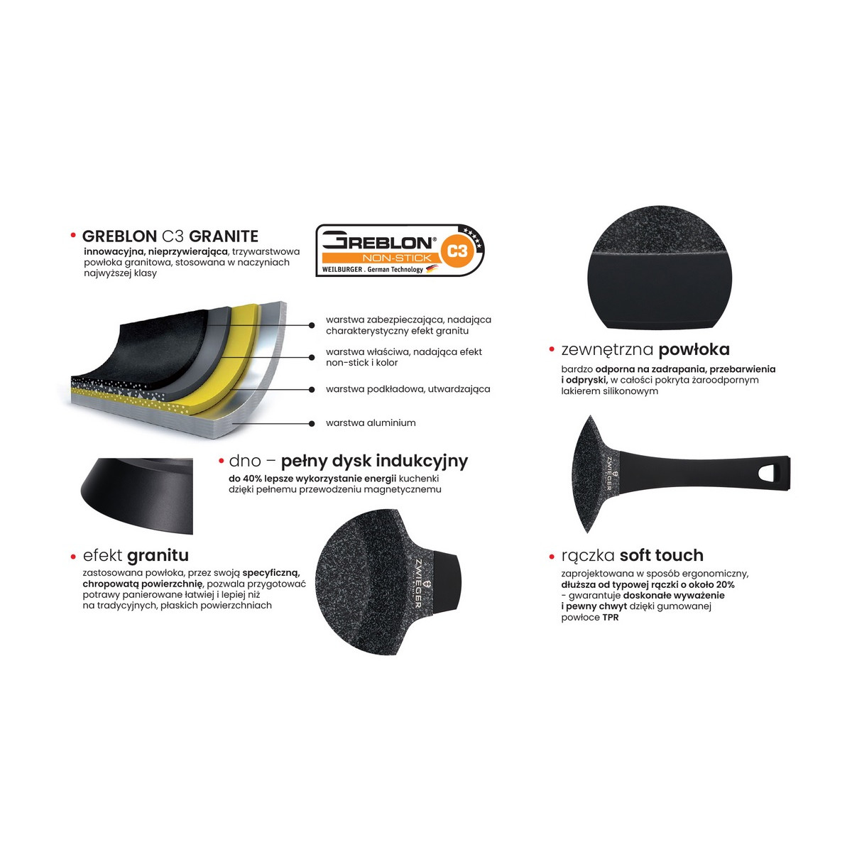 Wok Zwieger z odlewanego aluminium. Nowoczesna, trzywarstwowa powłoka granitowa GREBLON C3 GRANITE pokrywa wewnętrzną część naczynia. Dzięki nowatorskiej technologii, pozwalającej zredukować ilość powłok do trzech warstw, wok doskonale przewodzi i akumuluje ciepło. Ze względu na swoje wyjątkowe właściwości, zwiększające odporność na zarysowania, powłoka GERBLON C3 GRANITE stosowana jest w naczyniach najwyższej klasy. Dodatkowo, żaroodporny lakier silikonowy, który pokrywa wok na zewnątrz, sprawia, że zachowuje on swój estetyczny wygląd na długie lata. Naszych naczyń można używać na wszystkich rodzajach kuchenek, w tym na płytach indukcyjnych. Co więcej, użyty pełny dysk indukcyjny, dzięki pełnemu przewodzeniu magnetycznemu, zapewnia lepsze wykorzystanie energii (30 – 50 %). Zastosowana nieprzywierająca powłoka pozwala smażyć przy minimalnym lub całkowitym braku użycia tłuszczu, co niewątpliwie przekłada się na zdrowy tryb życia. Maksymalna temperatura pracy wynosi 240 st.C. Ponadto, rączka została wykonana z materiału PP, który nie przewodzi ciepła, a dodatkowo posiada specjalną powłokę soft touch, zapewniającą wygodny i pewny chwyt.
