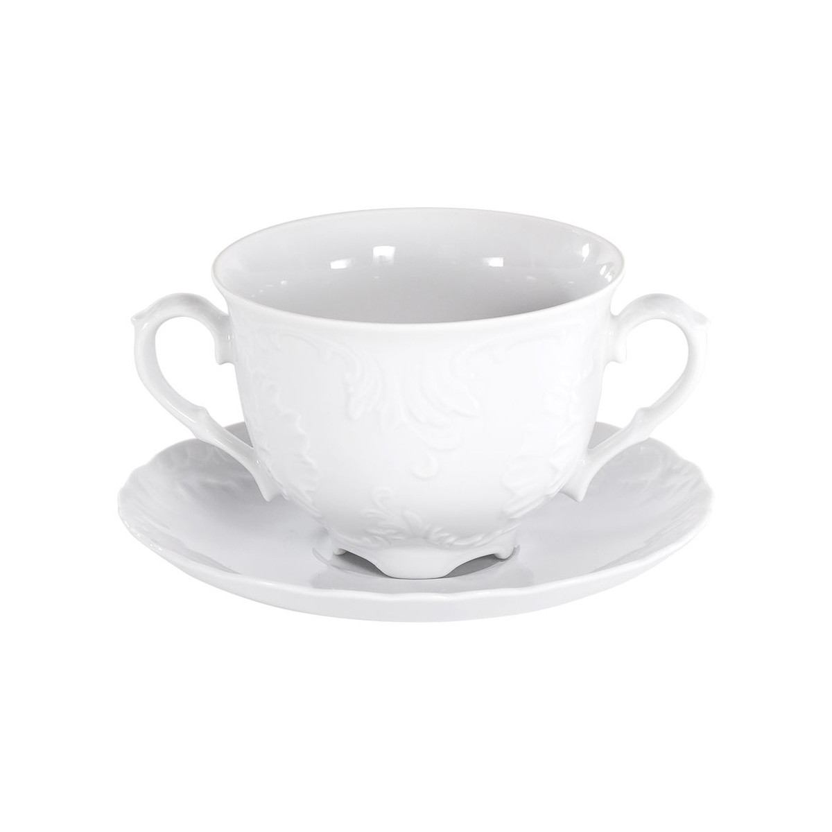 Rococo biała filiżanka do bulionu polskiej marki Ćmielów. Filiżanka do bulionu z dwoma uchwytami na wygodne chwycenie filiżanki. Biała, niedekorowana bulionówka o ponadczasowym fasonie Rococo idealnie wpasuje się na stół. Porcelana bez zdobień będzie odpowiednim wyborem dla osób korzystających z mikrofalówek i zmywarek.