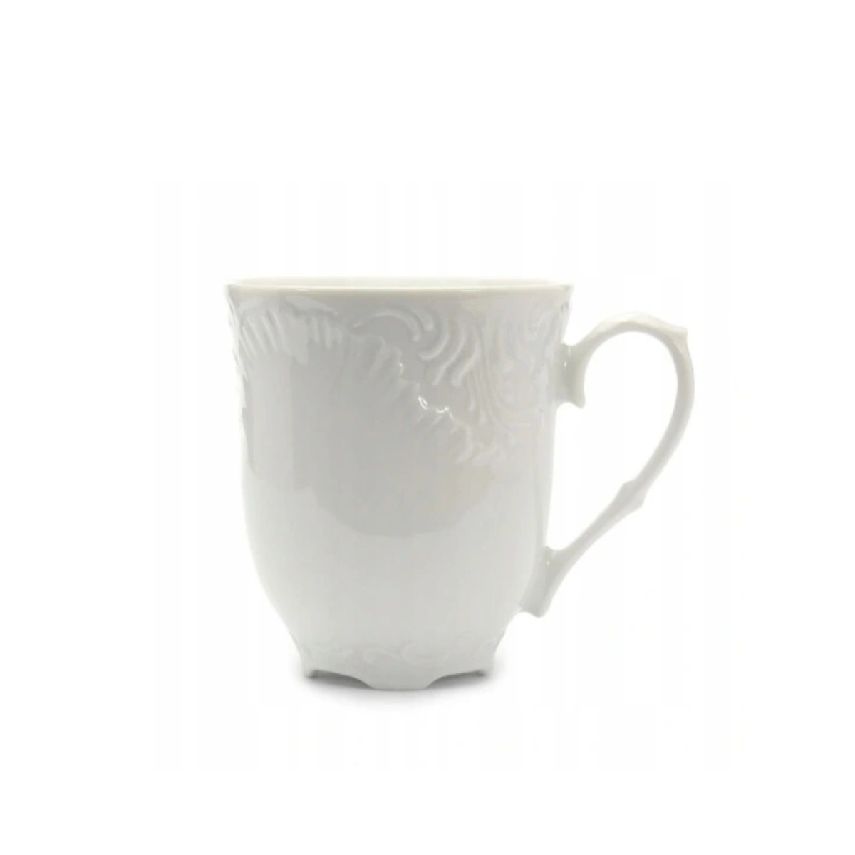 Biały kubek Rococo polskiej marki Ćmielów. Kubek z najwyższej jakości polskiej porcelany, ręcznie dekorowany. Nadaje się do zmywarki i kuchenki mikrofalowej.