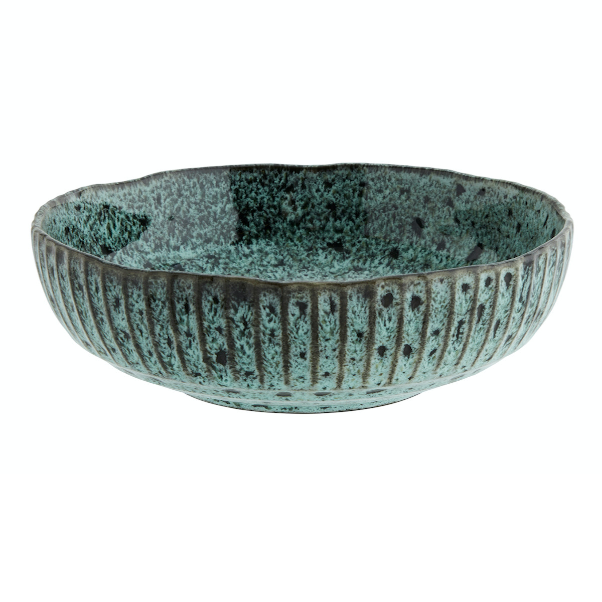 Zielono, czarna misa z kamionki do serwowania posiłków. Misa jest częścią serii talerzy, misek i kubków. Produkt nadaje się do mycia w zmywarce.