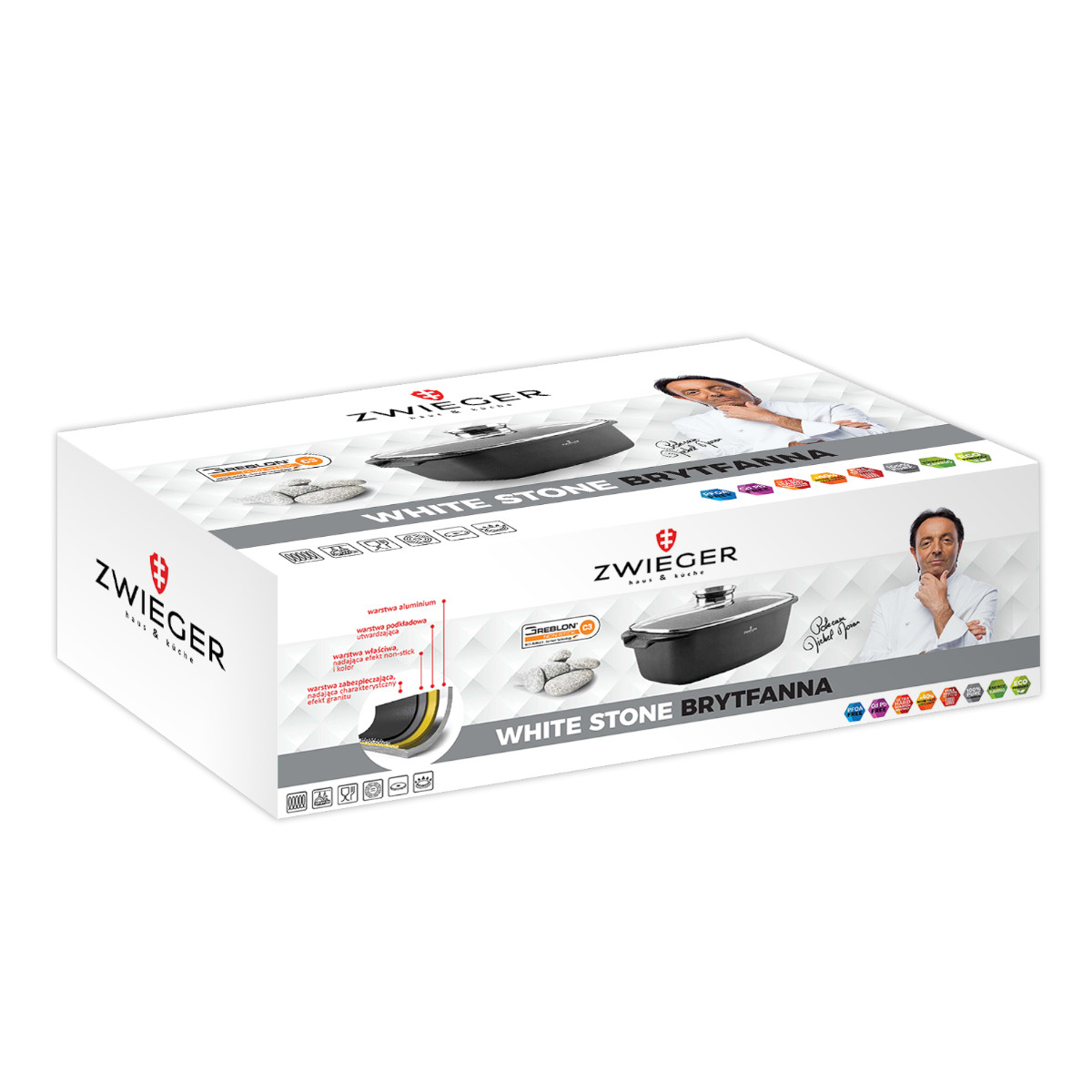 Brytfanna Zwieger z odlewanego aluminium. Nowoczesna, trzywarstwowa powłoka granitowa GREBLON C3 GRANITE pokrywa wewnętrzną część naczynia. Dzięki nowatorskiej technologii, pozwalającej zredukować ilość powłok do trzech warstw, brytfanna doskonale przewodzi i akumuluje ciepło. Ze względu na swoje wyjątkowe właściwości, zwiększające odporność na zarysowania, powłoka GERBLON C3 GRANITE stosowana jest w naczyniach najwyższej klasy. Dodatkowo, żaroodporny lakier silikonowy, który pokrywa brytfannę na zewnątrz, sprawia, że zachowuje ona swój estetyczny wygląd na długie lata.