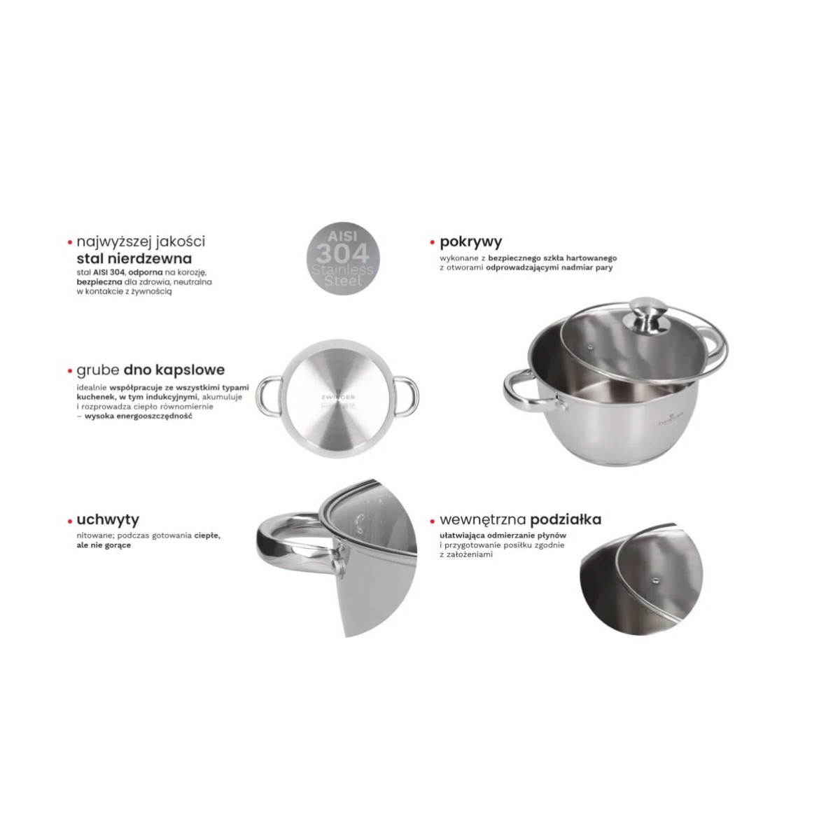 Garnki MULTIMA zostały wykonane z wysokiej jakości stali nierdzewnej AISI 304 – materiału odpornego na korozję, którego wyjątkowa gładkość pozwala na szybkie i łatwe pozbycie się przypaleń i zapachów. To zestaw 3 najpotrzebniejszych, najczęściej używanych garnków w każdej kuchni. Zastosowane grube, kapslowe dno zapewnia równomierną dystrybucję ciepła, energooszczędność oraz umożliwia idealną współpracę ze wszystkimi rodzajami kuchenek, w tym z płytami indukcyjnymi. O wysokiej jakości całego zestawu świadczą również solidne ścianki naczyń oraz idealnie dopasowane, wypukłe pokrywy z bezpiecznego szkła hartowanego z otworami odprowadzającymi nadmiar pary. W zestawie zastosowano nienagrzewające się, nitowane uchwyty, których design idealnie współgra z estetyką garnków. We wnętrzu garnków zastosowano podziałkę litrażową ułatwiającą odmierzanie płynów i przygotowanie potrawy zgodnie z założeniami.