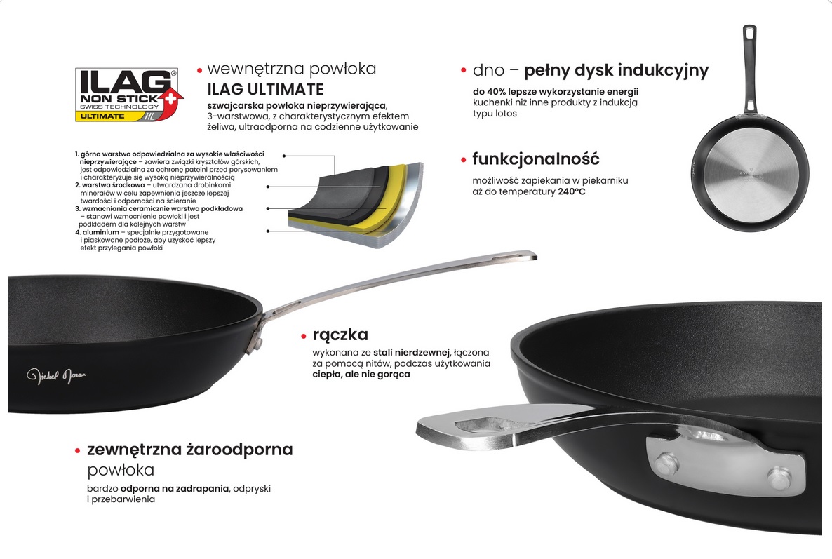 - ILAG ULTIMATE – szwajcarska powłoka nieprzywierająca, 3-warstwowa, z charakterystycznym efektem żeliwa, ultraodporna na codzienne użytkowanie