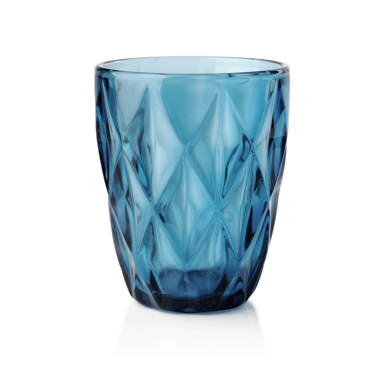 Komplet 6 szklanek do soku lub wody . Szklanki z barwionego na niebiesko szkła z elementem dekoracyjnym w postaci optyku skręconego, w którym pięknie odbijają się refleksy świetlne.