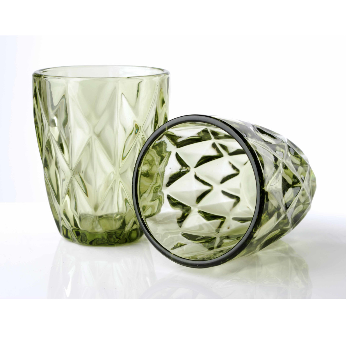 Komplet 6 szklanek do soku lub wody. Szklanki z elementem dekoracyjnym w postaci optyku skręconego, w którym pięknie odbiją się refleksy świetlne; z barwionego na zielono szkła.