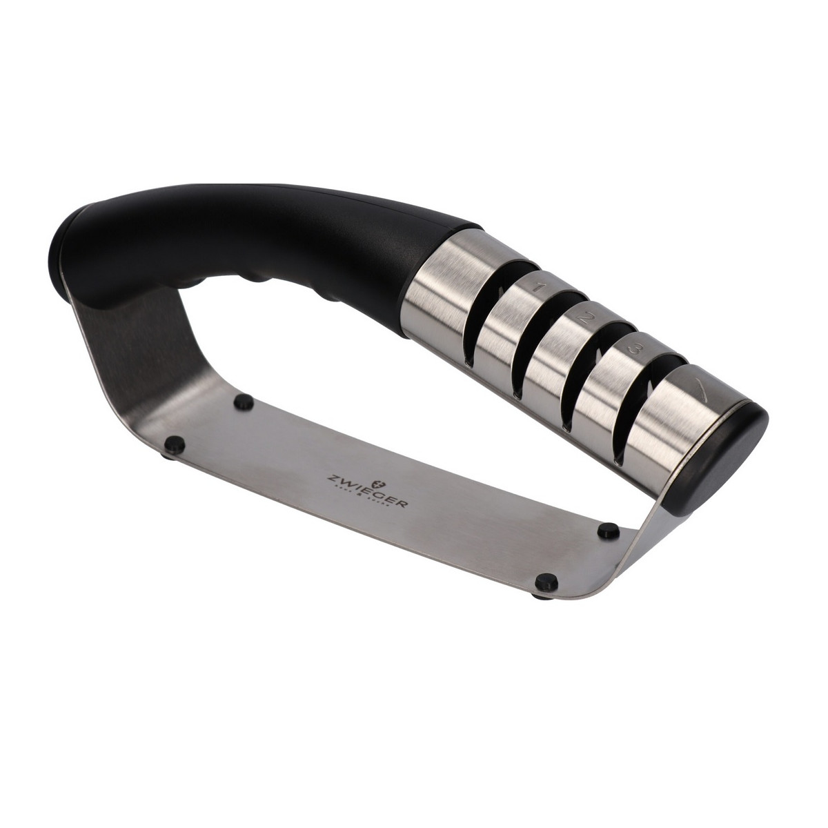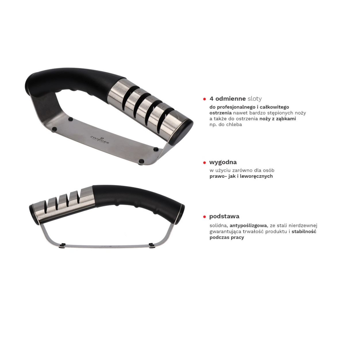Ostrzałka 4-slotowa VISIONARY to najwyższej jakości produkt do profesjonalnego ostrzenia noży. Każdy slot ostrzałki posiada wewnątrz unikalne rozwiązanie szlifierskie, które odpowiada za inny etap ostrzenia, przy czym czwarty, ostatni stopień przeznaczony jest do ostrzenia noży z ząbkami. Zbudowana z twardej stali nierdzewnej podstawa, z przymocowanymi antypoślizgowymi nóżkami, gwarantuje stabilizację produktu podczas użytkowania, a w połączeniu z czarnym, opływowym uchwytem dodatkowo tworzy niebanalny, elegancki design. Ostrzałka doskonale sprawdzi się zarówno u osób prawo- jak i leworęcznych. Przemyślana konstrukcja gwarantuje trwałość produktu oraz profesjonalne ostrzenie nawet bardzo stępionych noży.