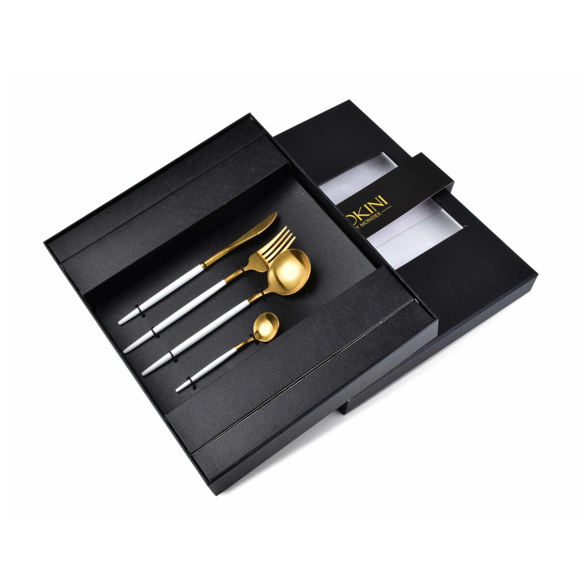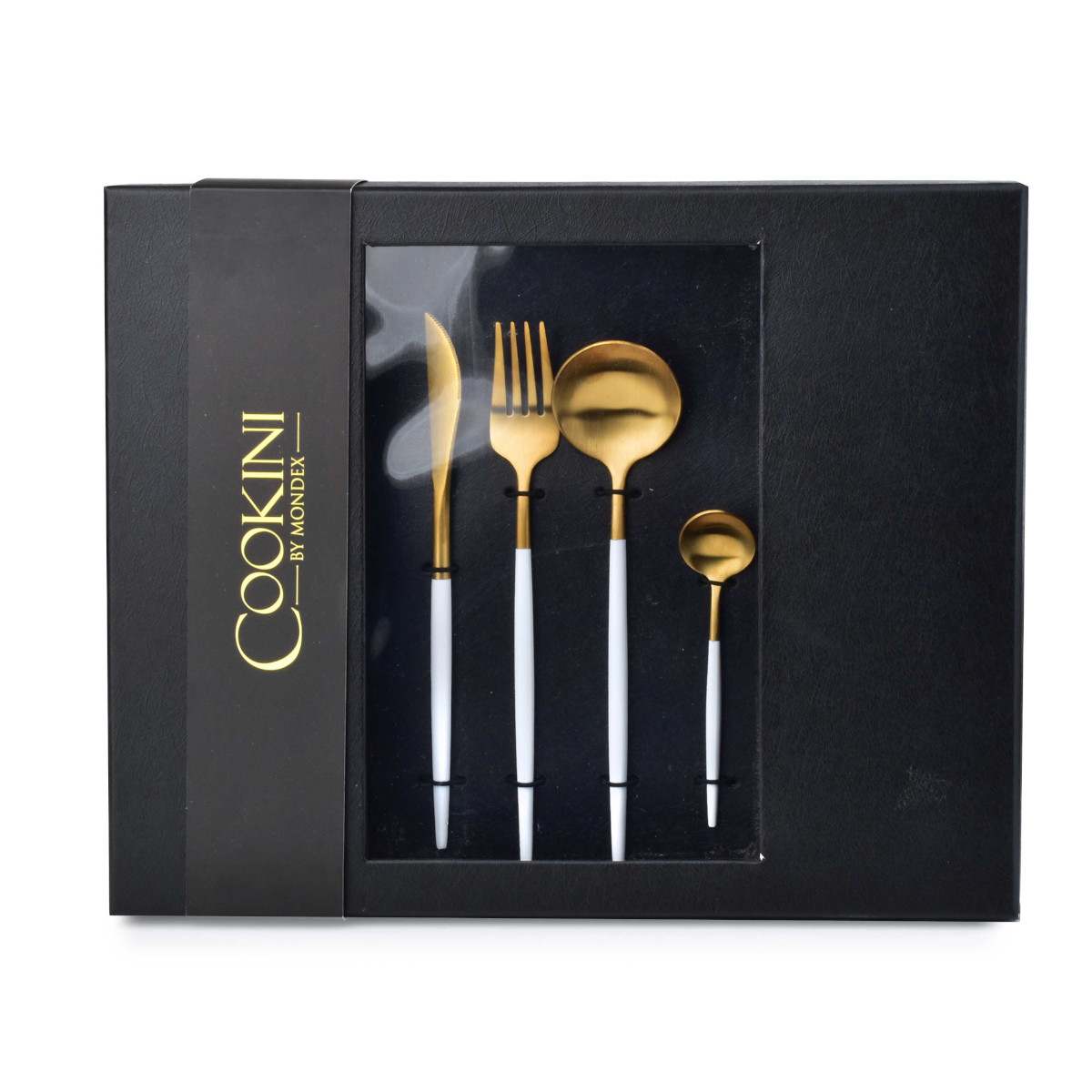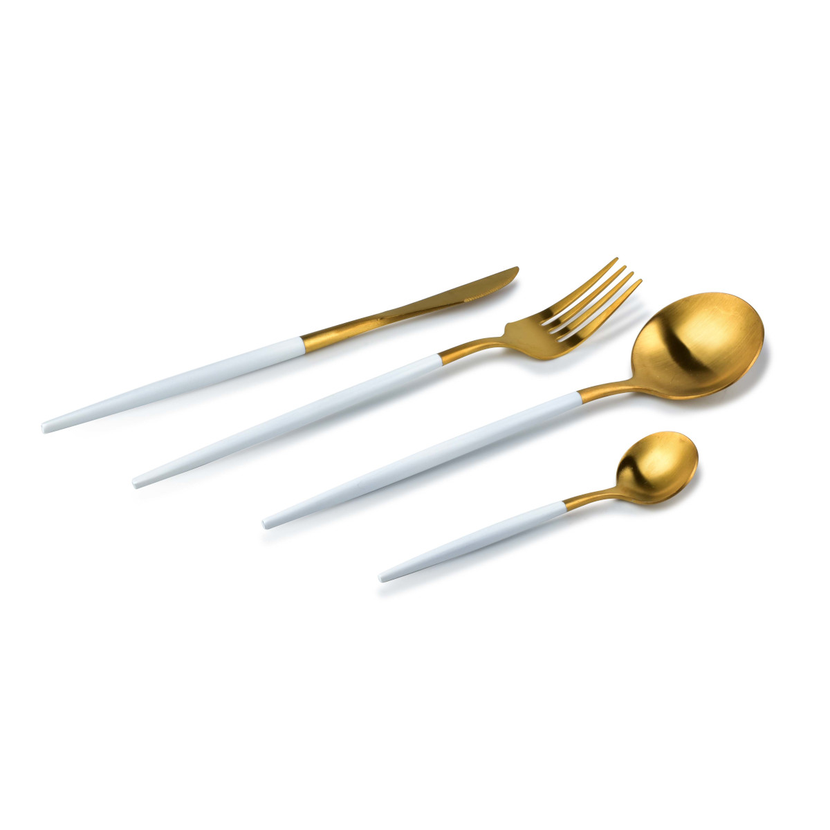 Komplet złotych sztućców z kolekcji CASA WHITE. Wykończenie matowe z białymi uchwytami. Idealnie nadają