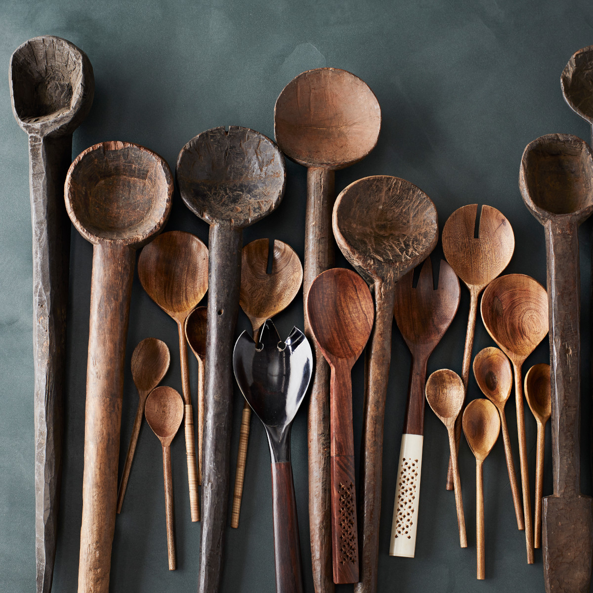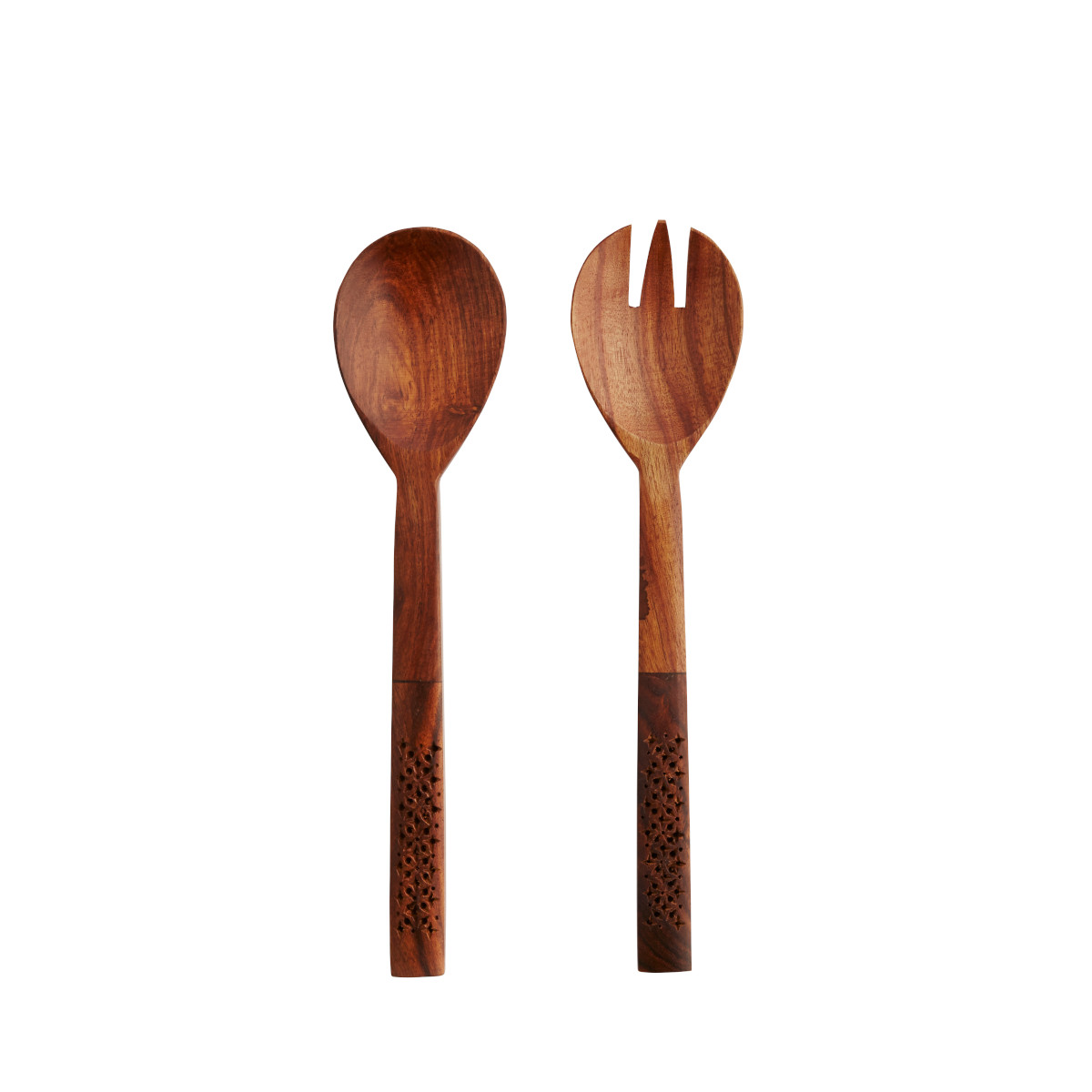 Sztućce składające się z łyżki i łyżko-widelca. Wykonane z drewna.