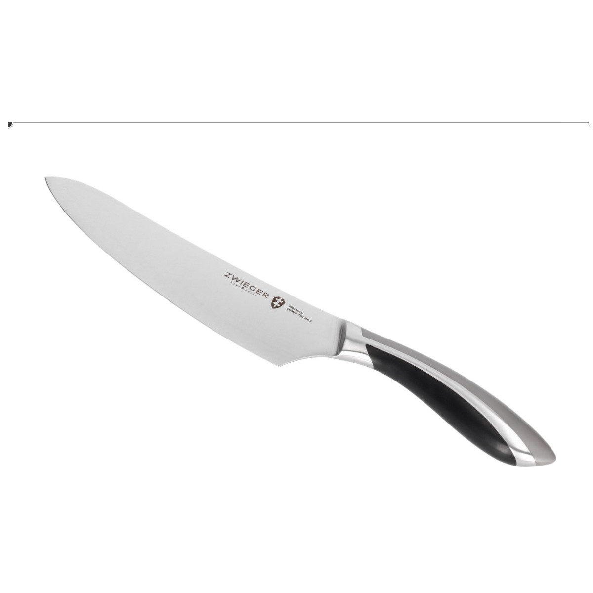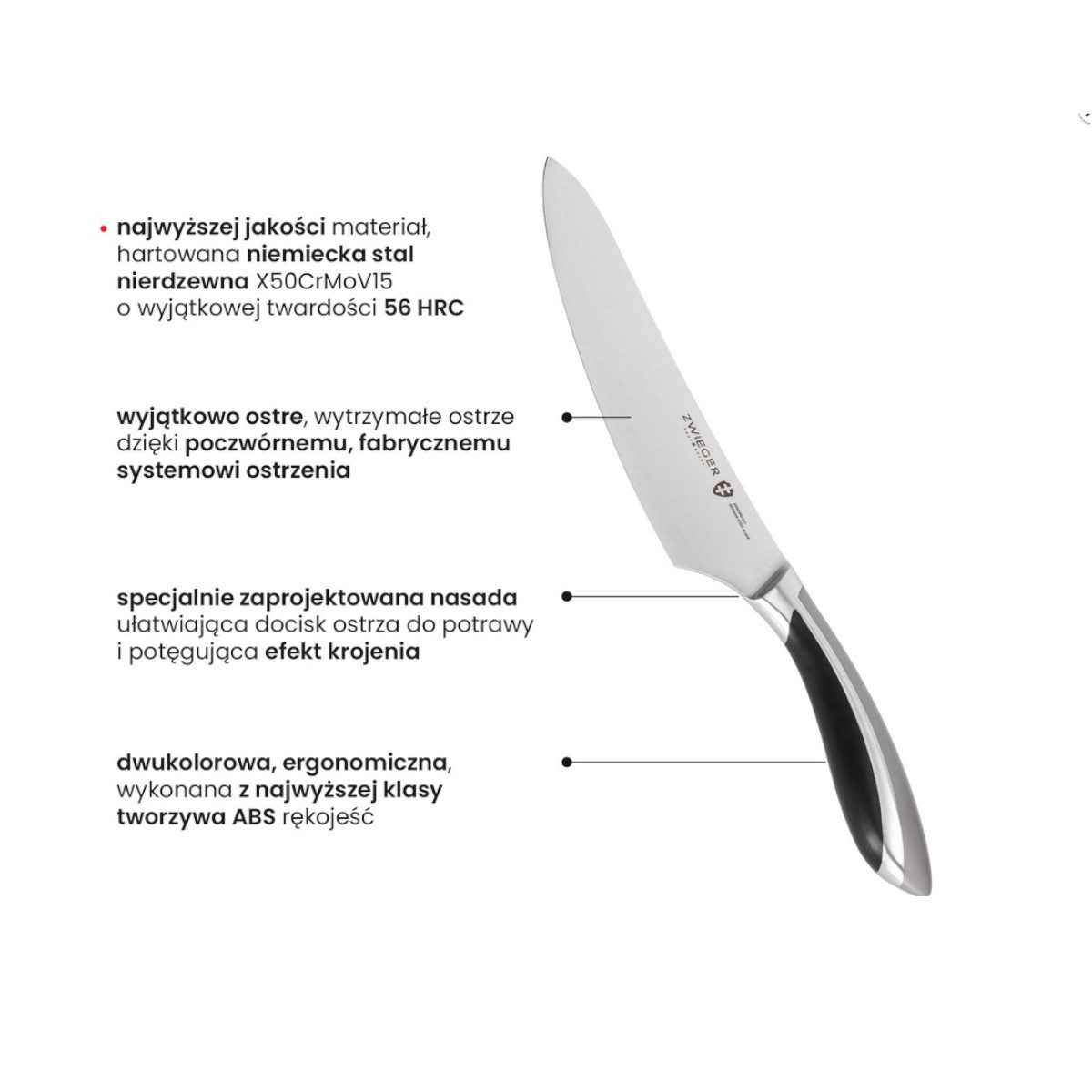 BLACK STONE to nowa, ekskluzywna linia noży wykonanych z najwyższej jakości niemieckiej stali nierdzewnej o symbolu X50CrMoV15, której twardość sięga aż 56 HRC. Ostrze zostało przygotowane z kilkunastu warstw stali, a następnie hartowane w wielostopniowym procesie temperaturowym regulowanym komputerowo, co sprawia, że noże są niezwykle trwałe i wytrzymałe. Dodatkowo ostrze zostało poddane poczwórnemu systemowi ostrzenia, który gwarantuje bardzo wysoką ostrość i możliwość długotrwałego użytkowania bez konieczności ponownego ostrzenia. Na uwagę zasługuje również oryginalna, wykonana z tworzywa ABS, doskonale wyprofilowana rękojeść zapewniająca ergonomię i wygodę krojenia. Zarówno precyzja wykonania, jak i efekt wizualny stanowią o wyjątkowości noży BLACK STONE, które zaspokoją oczekiwania nawet najbardziej wymagających klientów.