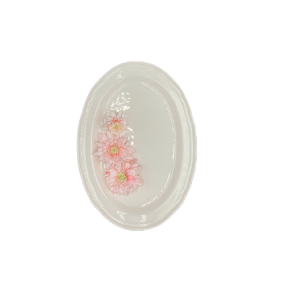 Półmisek wykonany z porcelany w delikatnym złamanym kolorze bieli.