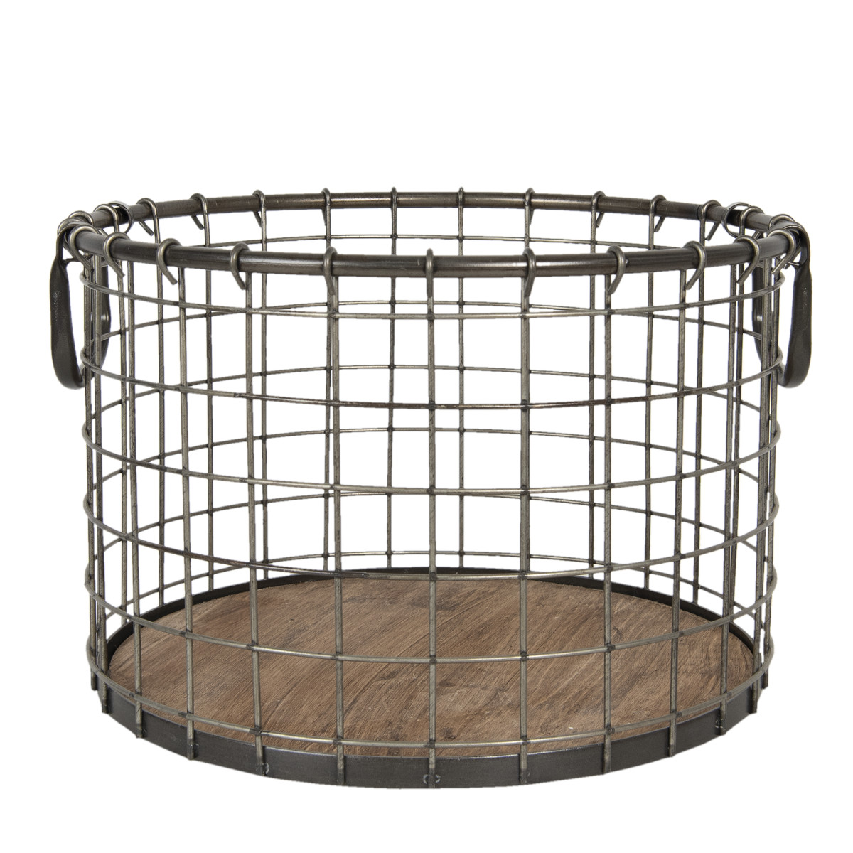 Kosz wykonany z metalu i drewna w brązowym kolorze.
