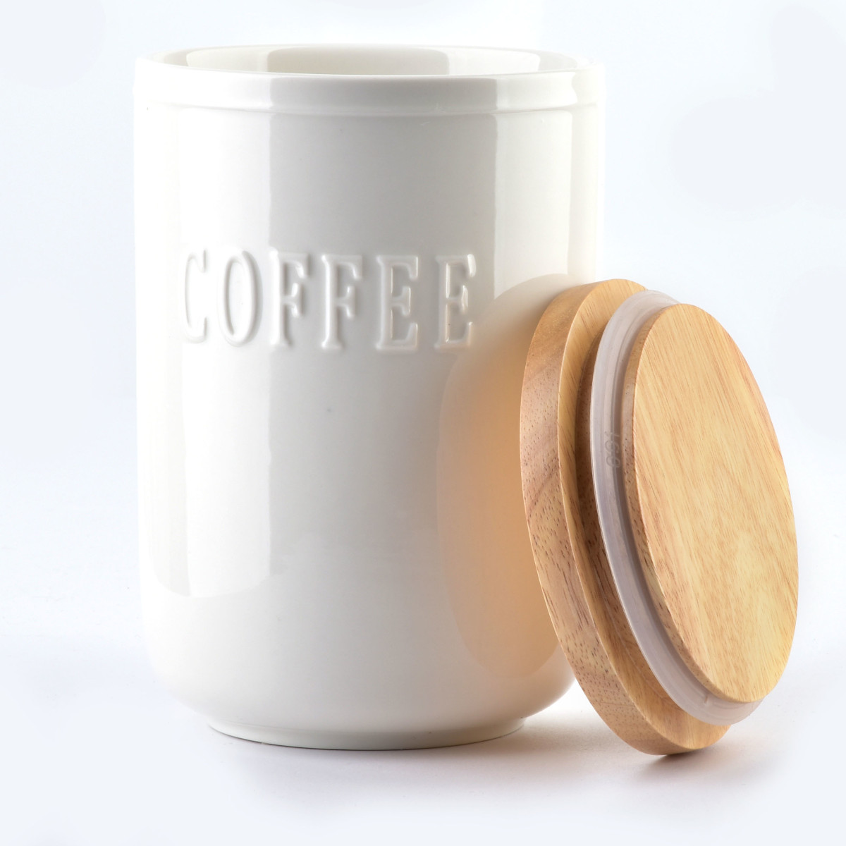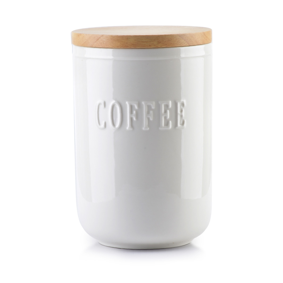 Pojemnik na kawę. Wykonany z porcelany z drewnianą przykrywką. Świetnie sprawdzi się do przechowywania pysznej, aromatycznej kawy. Idealnie będzie wyglądać na blacie oraz w szafce kuchennej. Warto używać go w parze z pojemnikiem na herbatę.