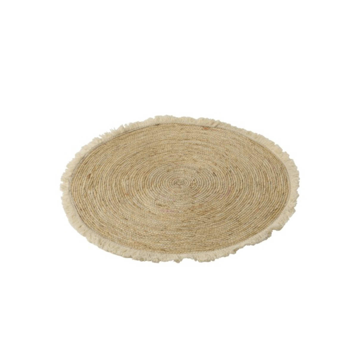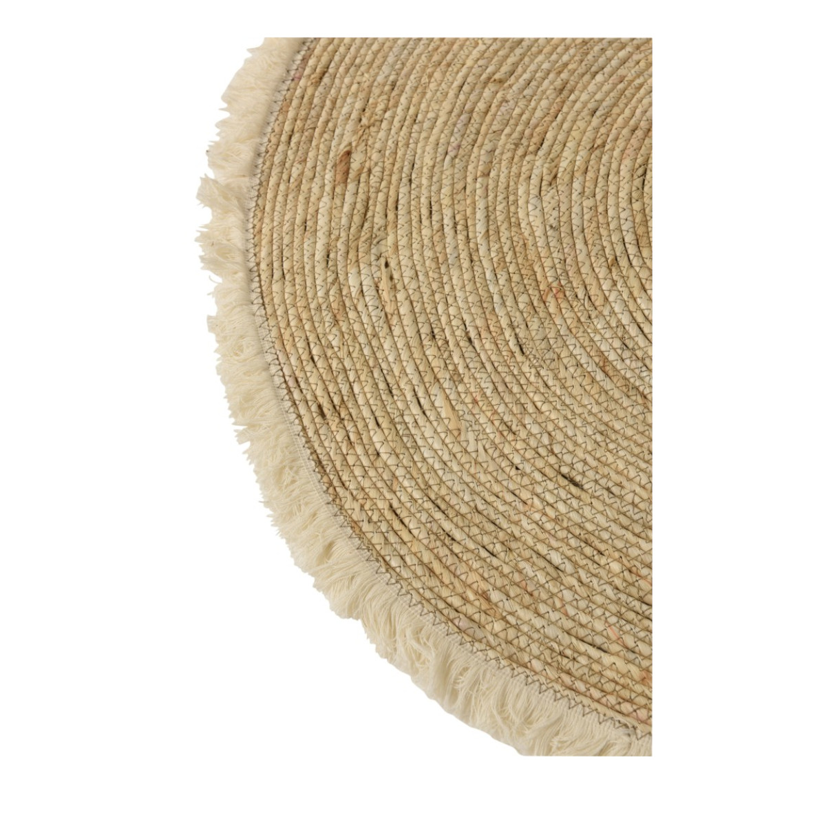 Dywanik-mata w kolorze beżu z białą chwostom jako wykończenie. Wykonany z naturalnych materiałów.