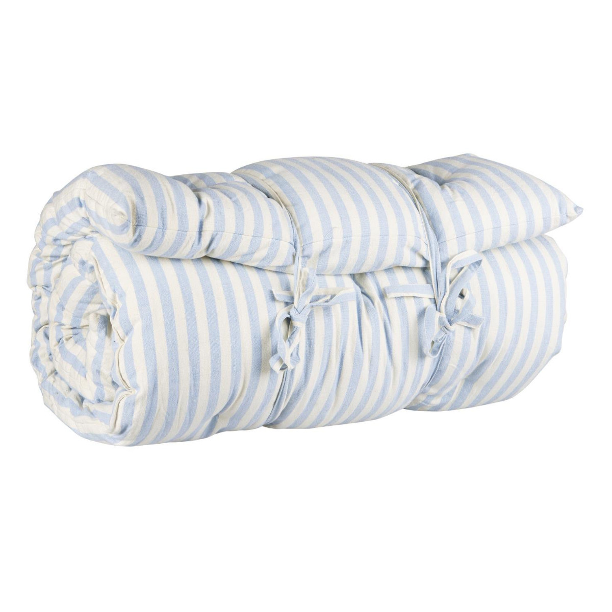 Dwustronny materac, wykonany z bawełny. W kolorze błękitu w białe pasy.