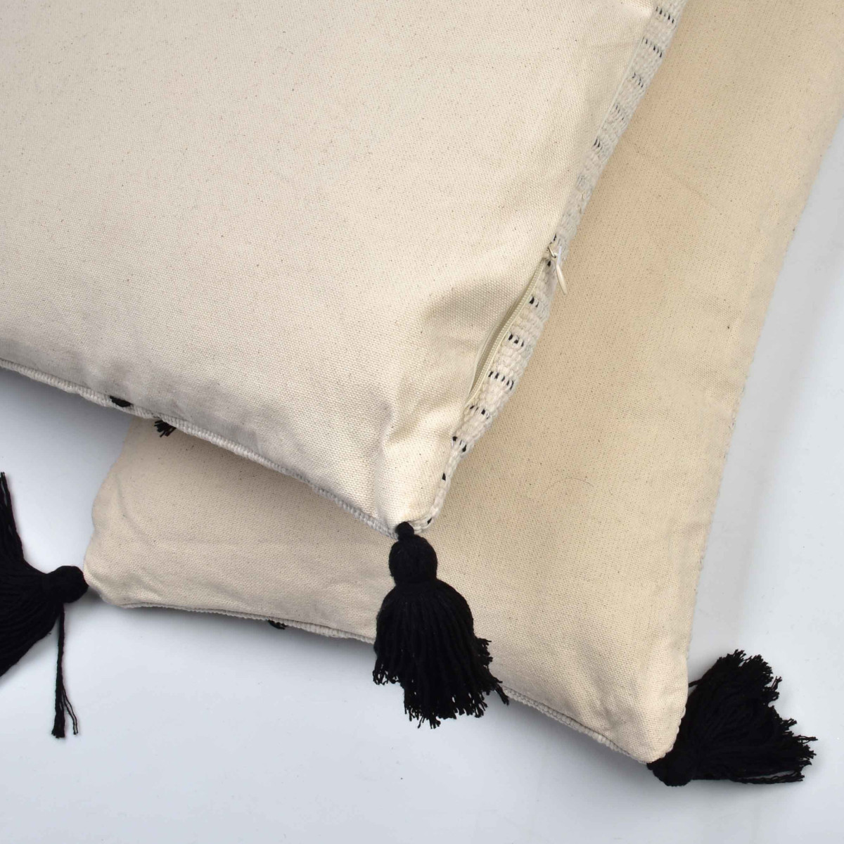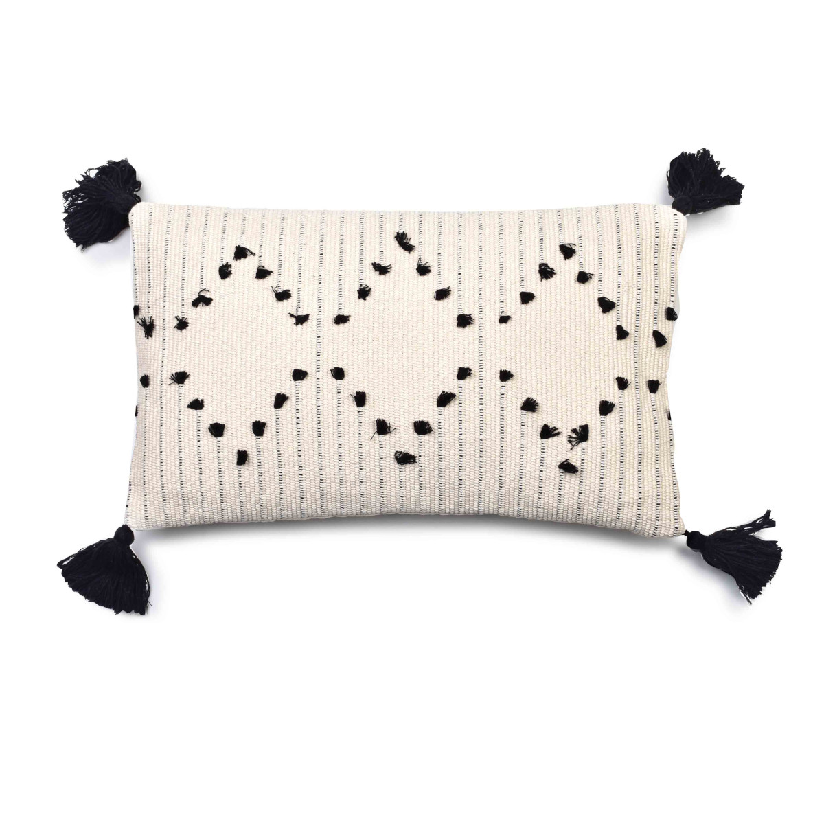 Poduszka BOHO idealnie wpasuje się naturalne wnętrza. Beżowa podstawa przeszyta czarnymi nićmi sprawia, że na poduszce powstaje ciekawy wzór. Dzięki chwostom poduszka nabiera lżejszej formy i dodają one luzu. Świetnie skomponowane kolory upiększą każdy salon, zadaszony taras lub balkon.